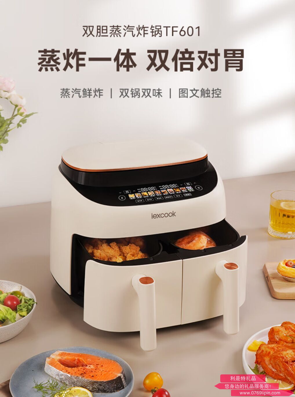 【雙桶雙味】【蒸汽炸烤】【2000W大功率】【十大功能觸摸彩屏】